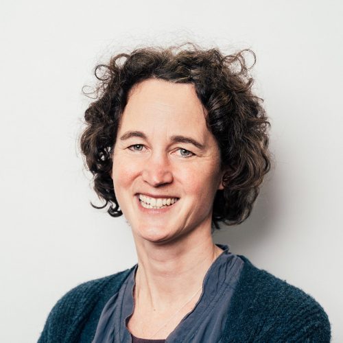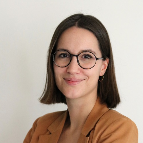 Eine blonde Person lächelt in die Kamera. Sie trägt dunkle Ohrringe und ein schwarzes Oberteil. Im Hintergrund sind die Blätter eines Baums zu sehen.